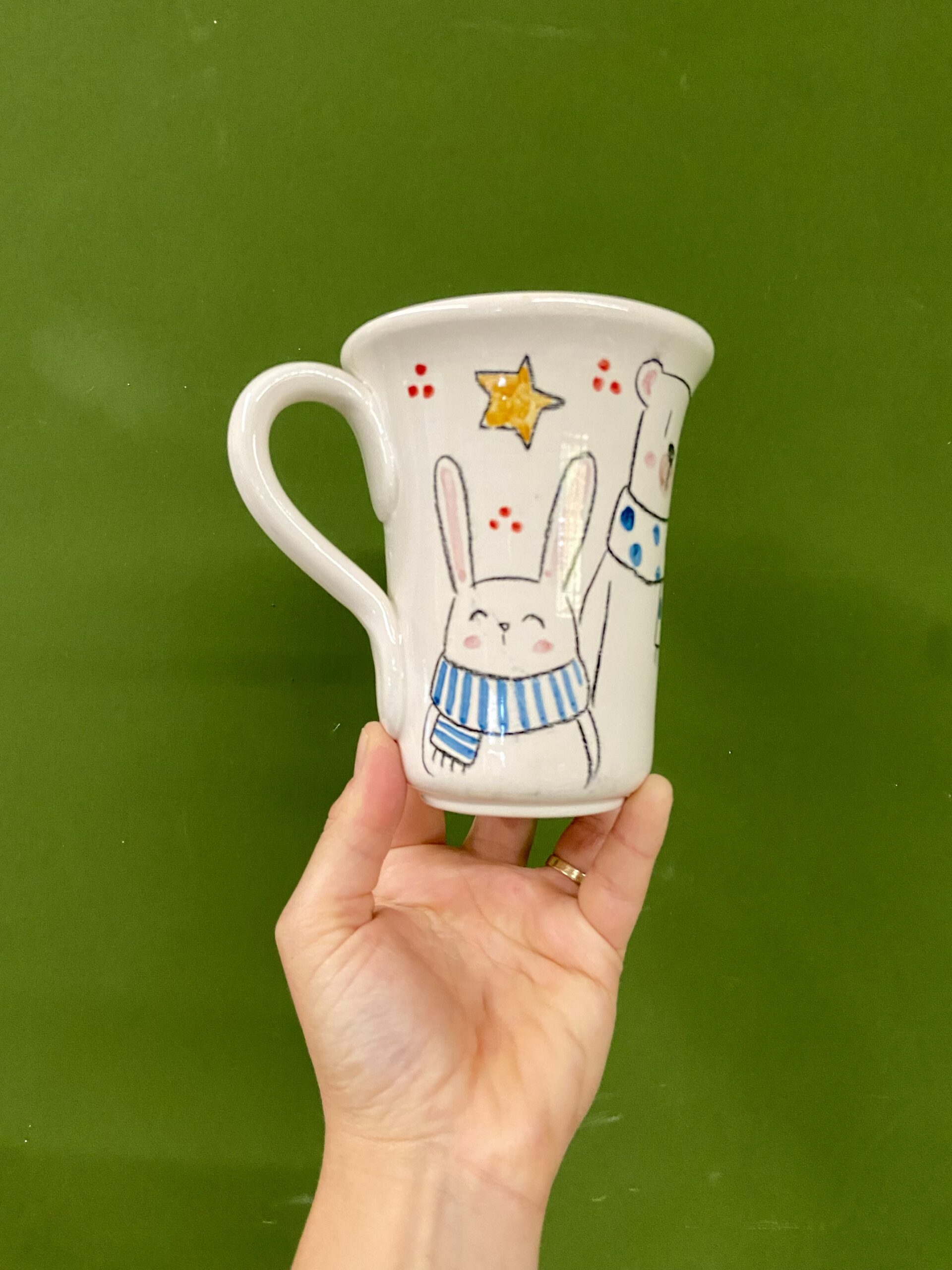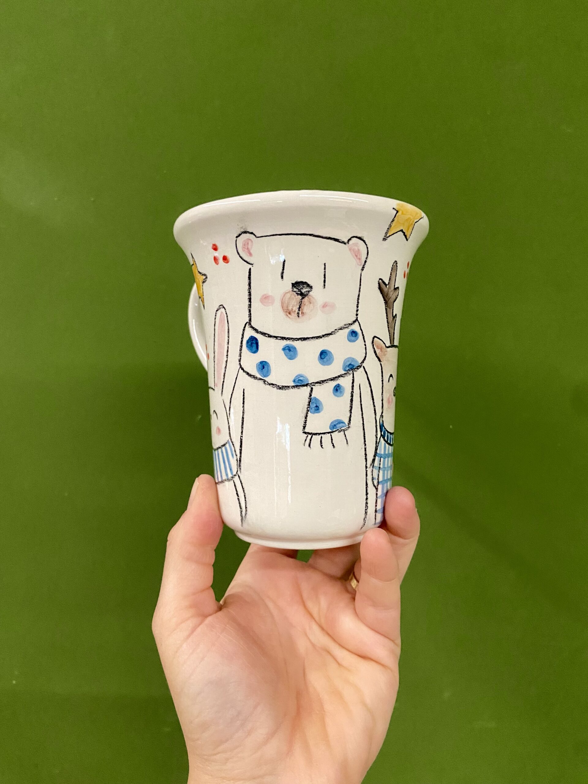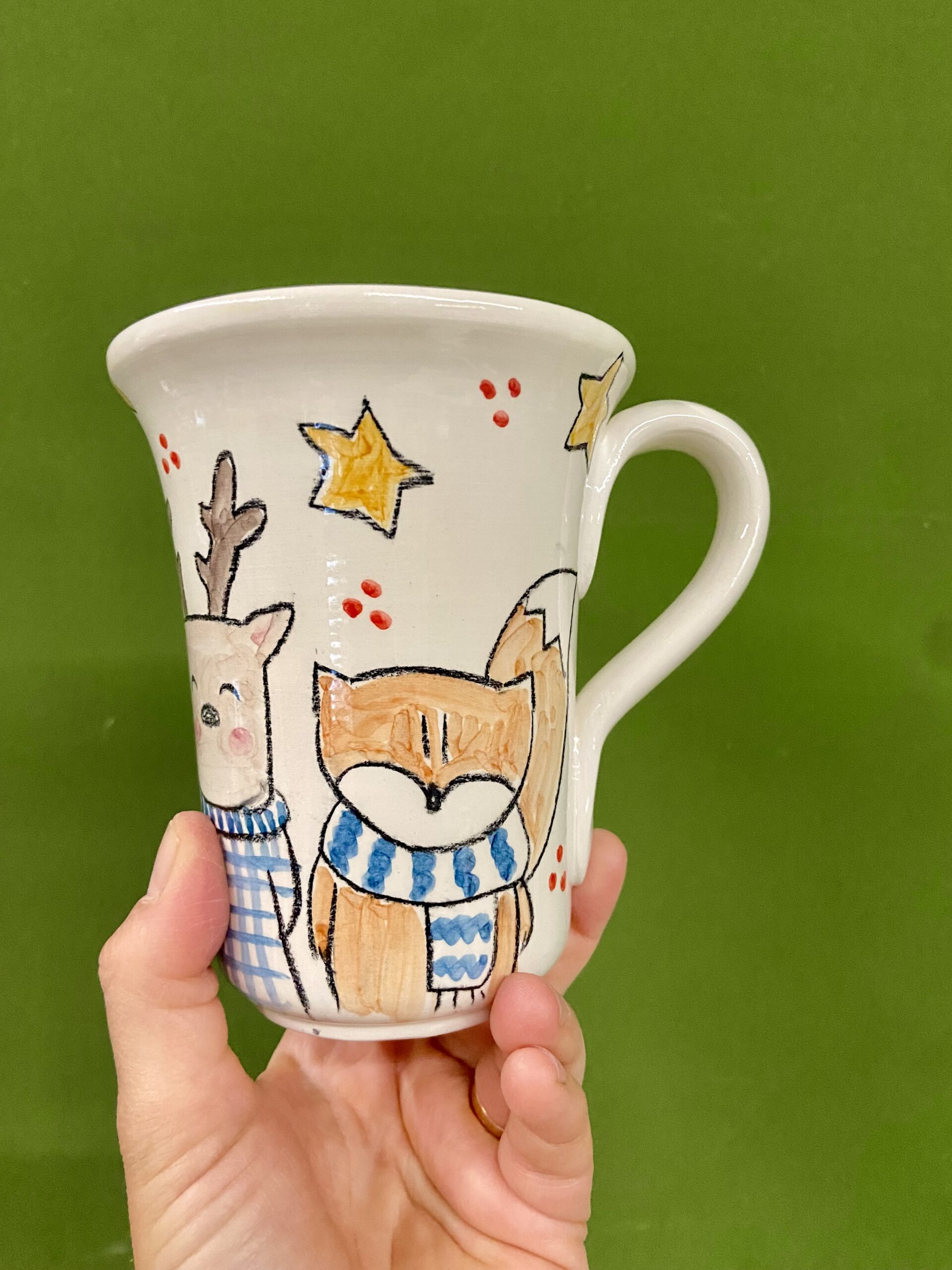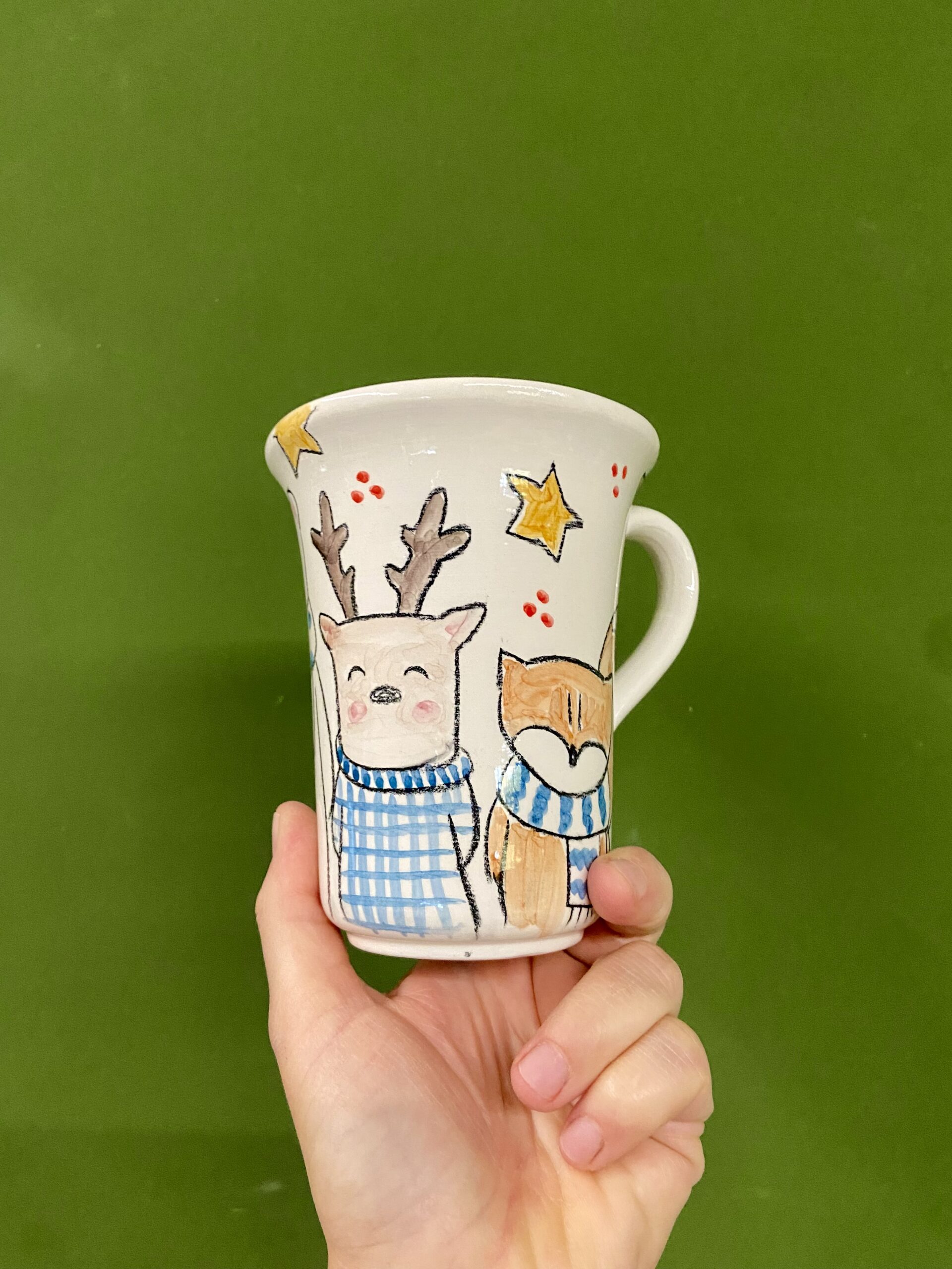 Tazza in ceramica realizzata e dipinta interamente a mano, perfetta per accompagnare le giornate invernali con una calda cioccolata o una tisana profumata.